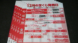 2025年11月14日ただいま店頭で『12月の宝くじ発売日チラシ』を配布中です。 こちらには11月から継続して販売される[年末ジャンボ (1枚300円)]を含む5種類の宝くじと、[初夢宝くじ(1枚 200円)]を始め12月に発売される6種類の宝くじ、計11種 の賞金等が掲載されています。 また裏面では[年末ジャンボ]&[ミニ]や数字選択式宝くじ 6種が紹介されていますよ。 2025年も良い事悪い事色々とありましたが、せめて年末は 宝くじto笑顔で締めくくりましょう! (T店長) <本日抽選日> [関中東自治宝くじ]第2697回 [ナンバーズ3&4]第6857回 [ロト7]第652回 ≪[年末ジャンボ]発売開始まであと7日!≫