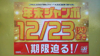 2025年12月18日ただいま発売中の[年末ジャンボ(1枚300円)]&[年末 ジャンボミニ(1枚300円)]の販売最終日は来週12/23(火) です。 例年と異なり“火曜日”終わりとなりますので、ご注意 くださいませ。 最終日前日の12/22(月)までは毎日“夜12時”まで営業 致しますが、最終日につきましては[ジャンボ]当店 在庫分が完売次第、時間に関わらず販売を終了させて いただきます。 また最終日に至らないまでも[ジャンボ][ミニ]共に連番 もしくはバラだけになる可能性もございます。 ご購入につきましては、出来るだけお早めにお願い致します。 なお最終日間近は例年、当店駐車場内が大変混み合います。 周辺道路に深刻な渋滞を起こす可能性が生じた場合、予告 無しに駐車場を閉鎖する措置を取らせていただきますので、 それを避ける為にも出来る限り夜間ご来店いただくか、 公共交通機関をご利用いただけますよう重ねてお願い申し 上げます。 (T店長) 『年末ジャンボプレミアム売り場限定キャンペーン』の シリアルカードにつきましては当店分配布終了致しました。 ご了承くださいませ。 <本日抽選日> [ナンバーズ3&4]第6881回 [ロト6]第2061回