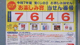 2025年10月30日令和7年度『宝くじの日 お楽しみ抽選(敗者復活戦)』の 申し込みは明日、10/31(金)が最終日です。 当選しなかった宝くじにつき再抽選を行い、敗者復活 された方に賞品が贈られる『お楽しみ抽選』。 昨年9/1から本年8/31までの間に抽選された宝くじの “ハズレ券”が敗者復活の対象です([スクラッチ]の該当 有無は券裏面参照)。 お手持ちのハズレ券で、 下4桁 7646 の番号券をお持ちの方は、店頭で配布中の「お楽しみ賞」 申込書に必要事項をご記入の上、該当ハズレ券(裏面に 住所・氏名・電話番号を記入)と共に、 〒115−8691 日本郵便株式会社 赤羽郵便局 私書箱第41号 「宝くじの日」事務局 へ簡易書留または特定記録郵便で明日までにお出しくだ さい(10/31当日消印有効)。 なお、賞品は12月中旬以降発送となりますので、ご了承 くださいませ。 (T店長) <本日抽選日> [ナンバーズ3&4]第6846回 [ロト6]第2047回
