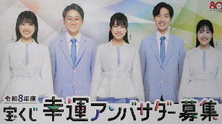 2025年10月31日来年4/1から宝くじのPR活動をしてくださる令和8年度 「宝くじ幸運アンバサダー」を、本日10/31(一粒万倍日!) より募集開始致します。 応募条件は、 1)令和8年4/1現在で、20歳以上の国内在住の方(性別は 問いません)。 2)地方出張が可能である事。 3)令和9年3/31まで1年間の契約期間中、宝くじのPR活動 を最優先していただき、指定した日に活動が可能な方(契約 後、他の仕事をする場合は、事前の承諾が必要)。 応募方法は、店頭で配布中の募集パンフレット内の応募 用紙に必要事項を記入し、ご本人が写ったカラー写真2枚を 添付して応募先に郵送していただくか、募集特設サイト からご応募くださいませ。 応募〆切は、12/1(月)。 書類審査の結果は、郵送にて応募者全員に通知致します。 募集は1ヶ月という短い期間ではありますが、皆さま どうぞ奮ってご応募くださいませ。 (T店長) なんとプロレスラー、ウナギ・サヤカが『ロト・ナンバーズ 超的中法』12月号の表紙に! 宝くじ専門誌とは言え、一般誌の表紙を単独で飾るのは たぶん初(裏表紙はあったけど)。 紆余曲折ありながらもフリーで頑張るウナギ選手には良い 看板になった筈。 これからも迷わず前へ前へ! <本日抽選日> [ナンバーズ3&4]第6847回 [ロト7]第650回